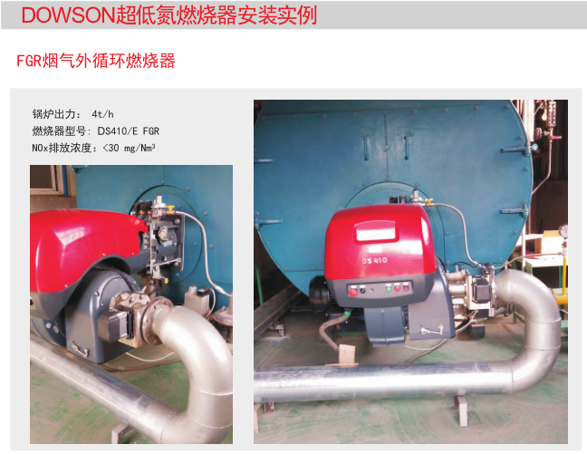 近年來,由于污染大幅度增加,全球各地,特別是所有高度工業化國家,對性能、能效和減排日益關注。為 了滿足日益增長的極低 NOx 排放要求,道森基于FGR(煙道再循環)低排放技術開發了新一代整體式(35012500kw)燃燒器,可達到最嚴格限值。 FGR技術是指對燃燒器空氣進氣口一側引入的部分廢氣實現再循環;集成電子控制通過三臺獨立的伺服電機, 可以控制空氣、燃料和廢氣的比例,以達到非常低的NOx排放,但同時任可保持運行的高度可靠性;點火槍 系統可保證所有型號燃燒器點火可靠性高。整體式燃燒器的所有組建都集成在一個緊湊的結構中,為安裝和 維護帶來了極大的便利。